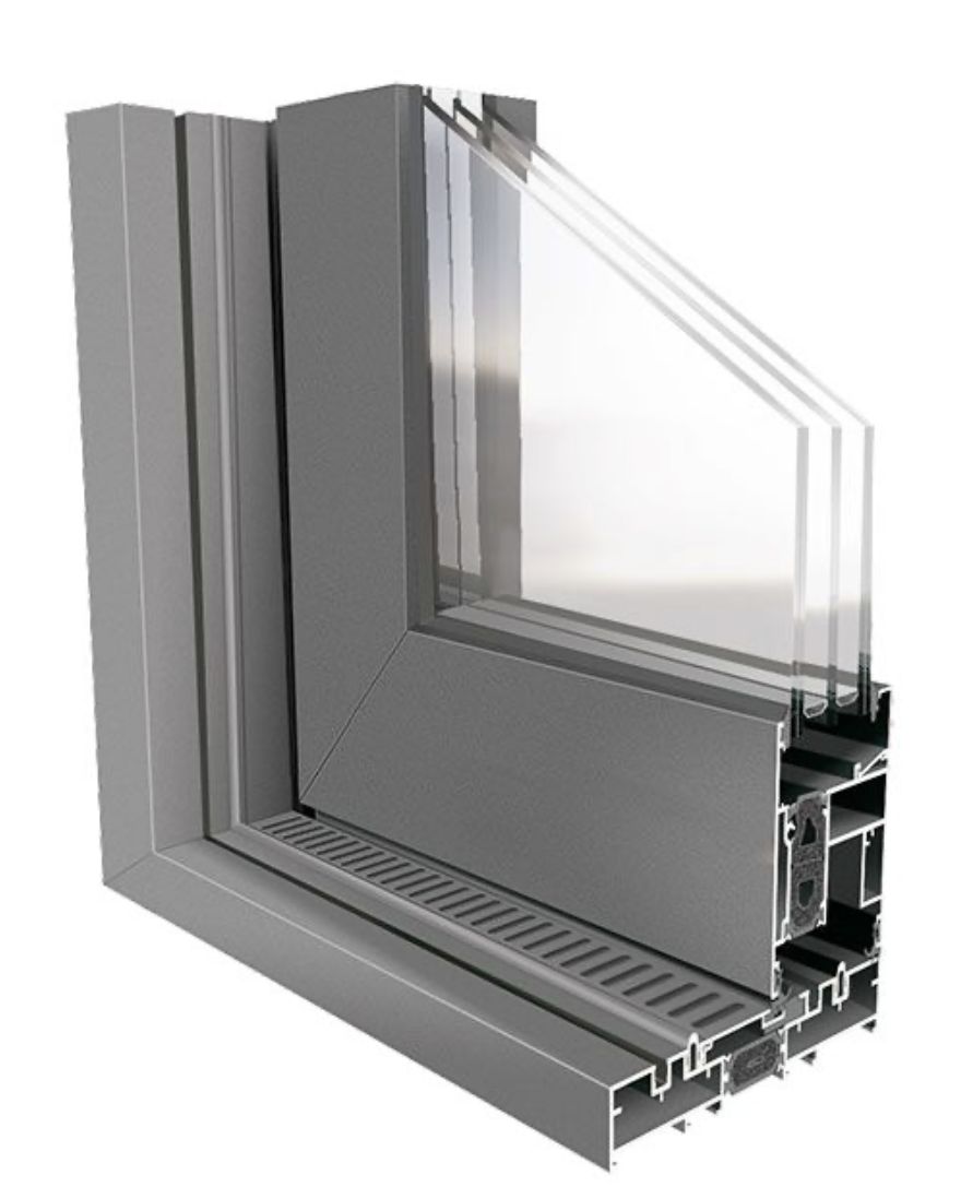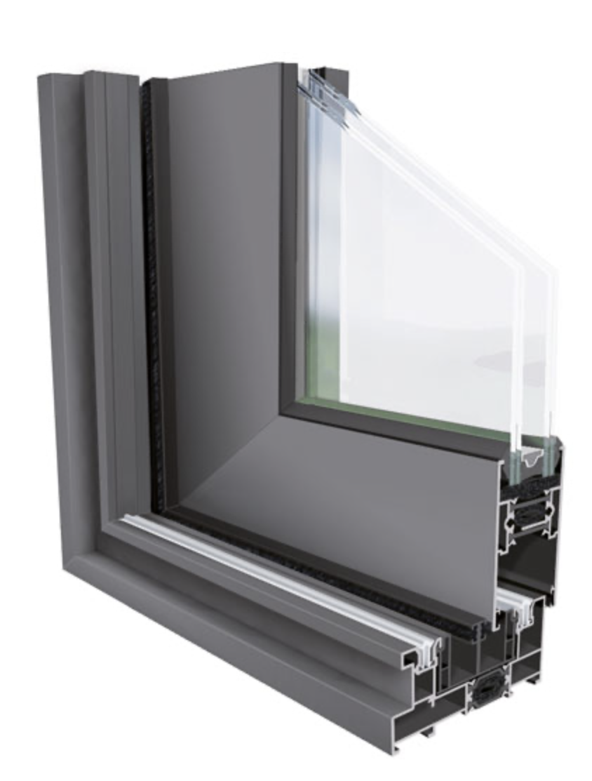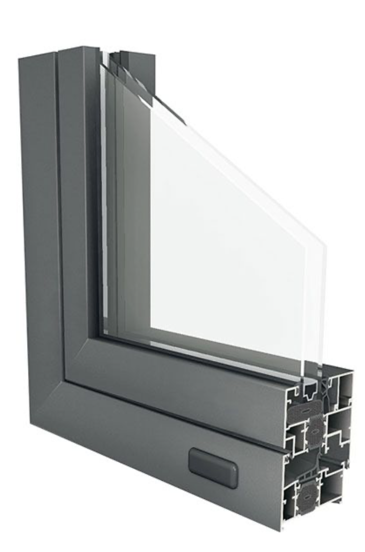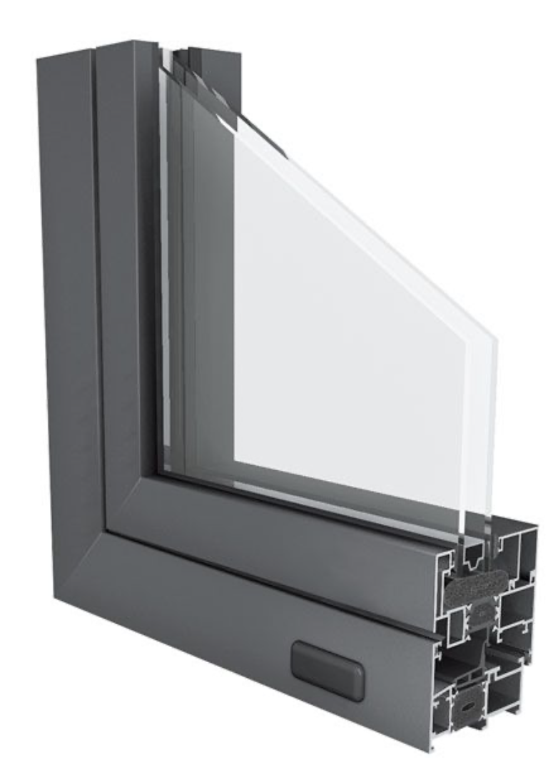 Sistema practicable de cámara europea y hoja oculta, con una profundidad de marco de 54 mm. Incorpora rotura de puente térmico con conexión sólida mecánica de poliamida de alta resistencia de 24 mm, con inserción de Thermic Plus (opcional): aislantes de baja conductividad térmica.